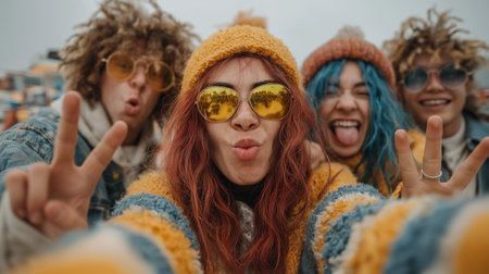 Group of Gen Z diverse young adults in quirky hats and sunglasses making playful faces taking selfie. Youth culture, friendship, and fun concept