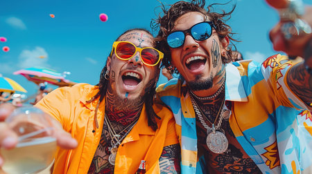 A vibrant summer music festival explodes with joy Smiling faces bask in the sun, sunglasses shielding eyes from the dazzling stage lights The air vibrates with infectious energy as friends revel in the music, creating unforgettable memories Good vibes flow freely, capturing the essence of summer bliss AI Generative