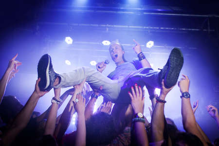 Raising crowdsurfer wearing shorts, black shoes inside club with lighting haze barrier, copy space. Concert, audience, night, energy, stage, atmosphere, celebration