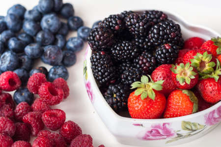 A delightful heart-shaped plate brimming with vibrant red raspberries, luscious blackberries, and juicy blueberries creates a stunning visual feast. This colorful display not only tempts the taste buds but also symbolizes love and health, perfect for sharing with someone special.