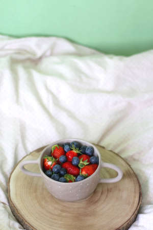 Bowl with blueberreis and strawberries and wooden tray on a bed. Selective focus.