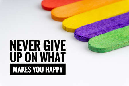NEVER GIVE UP ON WHAT MAKES YOU HAPPY text and colorful wooden stick on white background