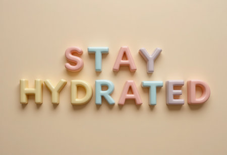 Colorful and playful letters spell out Stay Hydrated against a soft beige background. This image serves as a cheerful reminder of the importance of hydration and wellness. Perfect for motivational decor.