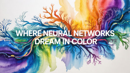 Abstract artwork featuring vibrant, colorful branching patterns resembling neural networks, with text Where Neural Networks Dream in Color in bold white font.