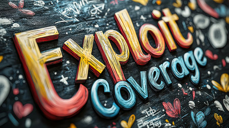 Vibrant and artistic typography featuring the words 'Exploit Coverage' in multicolored hand-drawn style. The image showcases creativity and expressive design elements on a textured background.