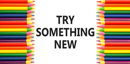 Try something new symbol. Concept words Try something new on beautiful white paper. Beautiful white background. Colored pencils. Business motivational lifestyle try something new concept. Copy space.