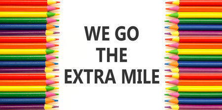 Support, help we go the extra mile symbol. Concept words We go the extra mile on beautiful white paper. Beautiful white background. Colored pencils. Business we go the extra mile concept. Copy space.