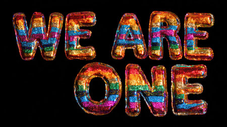 We are one message quote for pride month with colorful glitter backdrop shining brightly in celebration