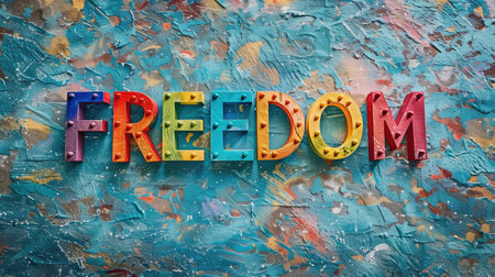 Freedom word made of multicolored wooden letters on a multicolored background