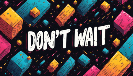 A striking design featuring colorful 3D blocks floating against a dark background, with the bold phrase DONT WAIT prominently displayed. This eye-catching graphic conveys a sense of urgency and excitement, perfect for motivating action and engagement.