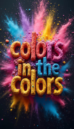 A stunning visual display features the phrase colors in the colors crafted from textured letters, surrounded by a vibrant explosion of colored powders. This dynamic composition radiates energy and creativity, inviting viewers to celebrate the beauty and diversity of color in art and life.