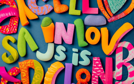 This vibrant image features oversized, textured letters in pastel colors, playfully arranged against a pink background. Surrounded by an array of delightful candy shapes and playful elements, it evokes a sense of fun and creativity, perfect for inspiring action and positivity.