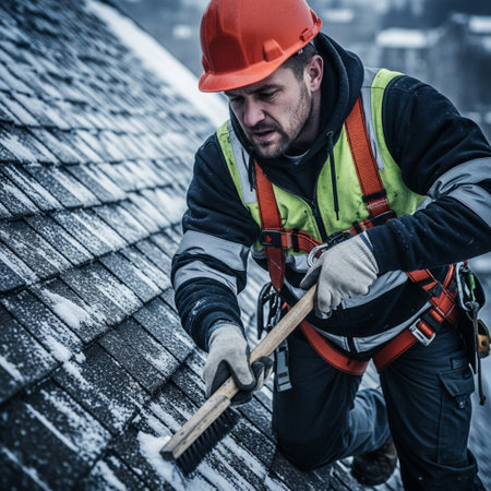 A worker standing on a snowy roof, using a shovel to clear snow under a bright blue sky. This scene captures winter maintenance and outdoor work in cold conditions.