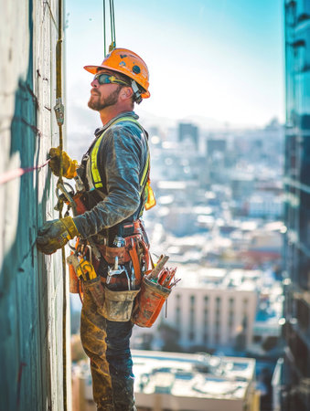 A construction worker wearing a hard hat and safety harness repairs and maintains the exterior of a high rise building working on the frame and facade against a cityscape skyline backdrop