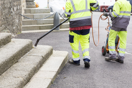 Security team installing safety road speed breaker or hump by using drill and hammer