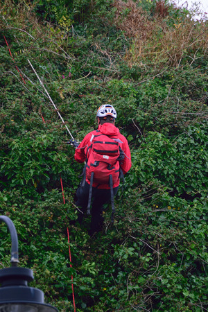 Workman in green pants and orange vest climbing up small hill in orange vest in Bologna, Italy