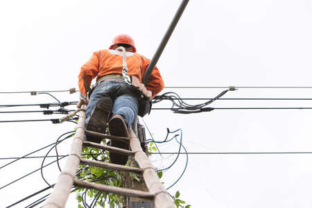 Lookup view of cable repair technician are to fix the lines of network cable and wires on electric pole and sky background.