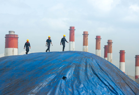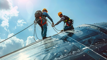Male Workers Securely Connect to Roof Fall Arrest Systems with Knots and Harnesses, Preparing to Ascend an Oil Tank Dome