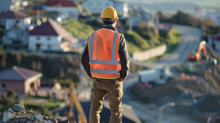 The site manager stands atop a hill overseeing the bustling activity on the construction site from a birds eye view