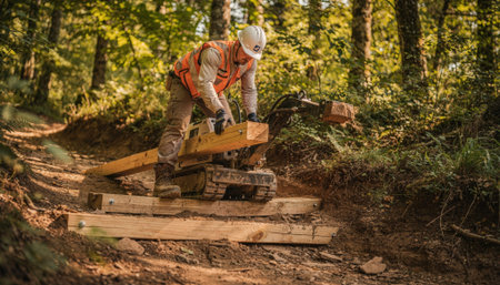 Worker installing wooden steps on steep trail using compact machinery centered in sharp detail with surrounding forest out of focus