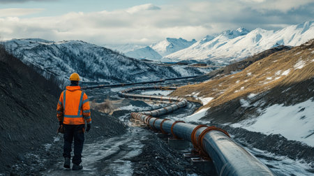 A construction worker surveys a series of pipelines winding through a cold, snowy mountain landscape under a clear sky