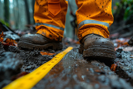 Worker in yellow boots on a construction site, close-up