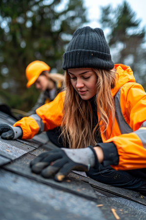 Young Woman in Orange Jacket and Black Beanie Engaged in Outdoor Manual Labor with Focus on Hands AI Generative