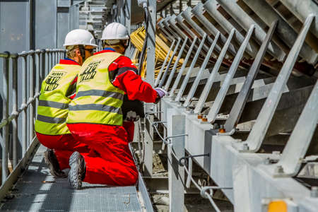 Rustenburg, South Africa, October 15, 2012, Conveyor belt transporting Platinum palladium ore for processing with mining safety inspectors checking for damage