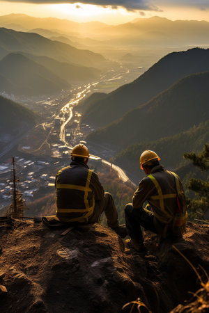Workers construction the extension of high-voltage towers, heavy industry, sunset silhouette, AI Generative.
