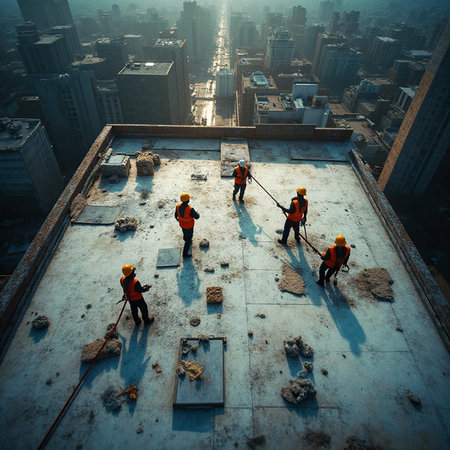 Cinematic editorial image of a focused construction worker, viewed at a Dutch angle, performing esse