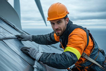 Industrial climber securing solar panels on a wind turbine nacelle, combining renewable energy sources