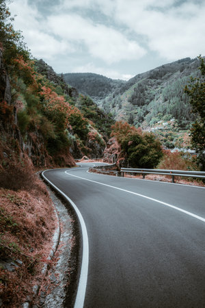 Curving asphalt road winding through colorful autumn mountain landscape with rocky slopes, guardrails, and trees in vibrant foliage under cloudy sky; vertical wide-angle shot