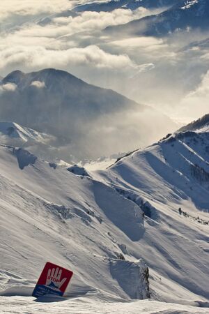 Aerial view of the Alps mountains in France. Mountain tops covered in snow. Alpine ski facilities from above.