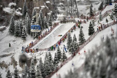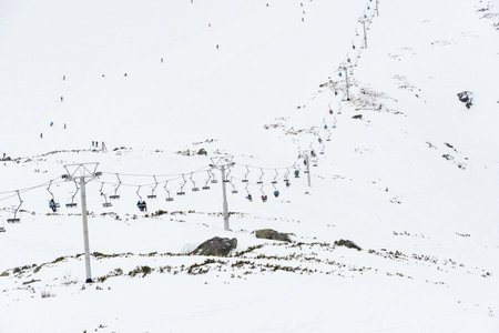 Skiing and snowboarding. A ski slope with a ski lift and small unrecognizable figures of people on a background of white snow, staffage