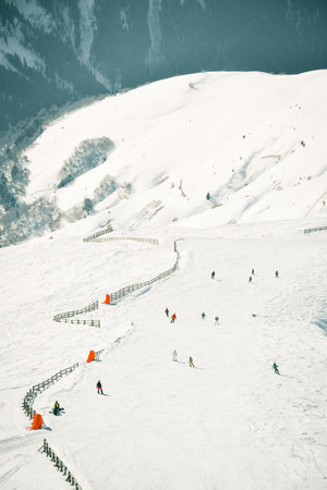 Many skiers enjoy skiing on snowy slopes in Tetnuldi ski resort caucasus mountains. Active winter holidays