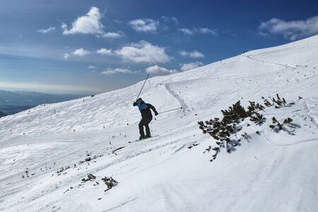 Skier skiing and jumping on fresh white snow hill on Sunny winter day in Chopok, Low Tatras in Slovakia. Professional skier dressed in dark black show us sample jump.
