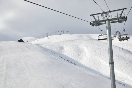 Chair ski lift for mountain skiers and snowboarders moves in the air on a rope on the background of winter snow capped mountains.