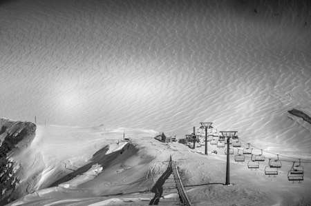 Empty ski lift in winter ski resort - Holidays. Winter landscape of mountain covered of snow in black and white. Glaciers 3000, Diablerets, Switzerland. Tranquility.