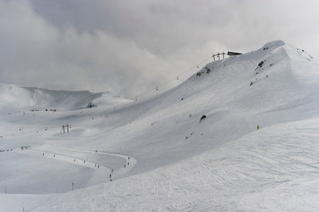 Skiing people and rope tow systems of Kitzsteinhorn ski region in Austria