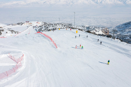 Aerial view of a snowy slope with people skiing and snowboarding on a winter day