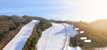 Ski resort, ski slope, ski lift, pine trees and fog mountains panorama