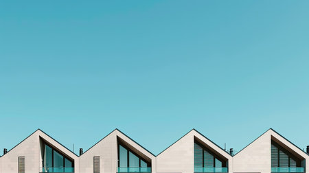 This image captures modern residential architecture featuring unique gable roofs, set against a vivid blue sky embellished with soft clouds. The design showcases clean lines and a minimalist aesthetic, highlighting the beauty of contemporary living spaces.