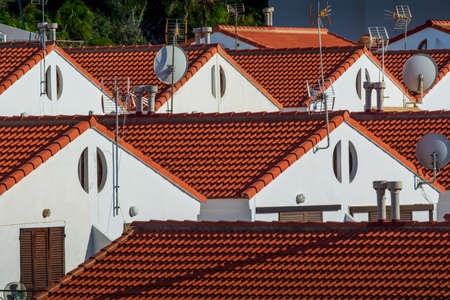 View of peaks of houses with clay tile roofs in Tucson, Arizona. Side view of facade of houses with stucco walls in a suburban neighborhood.