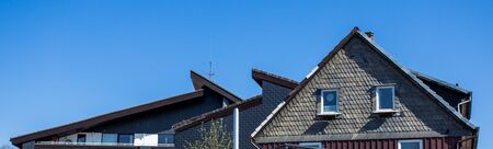 Upper part of residential houses against the clear blue sky background