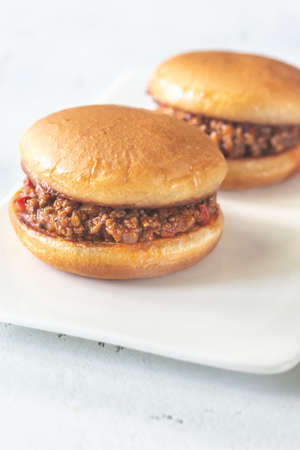 Sloppy joe - American sandwich on the white plate close up