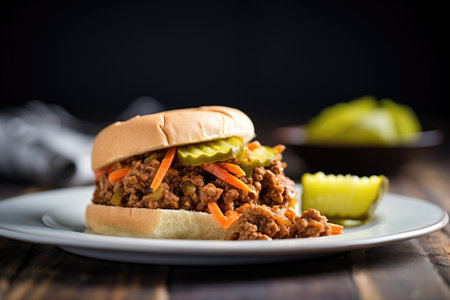sloppy joe with pickled cucumber slices on the side
