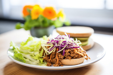 sloppy joe on whole wheat bun, side salad garnish
