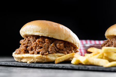 homemade BBQ Sloppy Joe sandwiches with french Fries on a black plate, flat lay, close-up, american cuisine