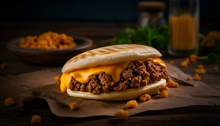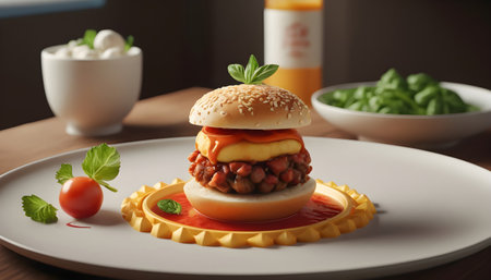 Grilled beef burger with cheddar cheese, tomato, and onion generated by artificial intelligence