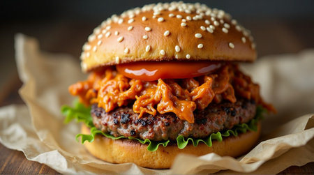 Juicy gourmet burger with pulled pork and lettuce served on parchment paper with a rustic background
